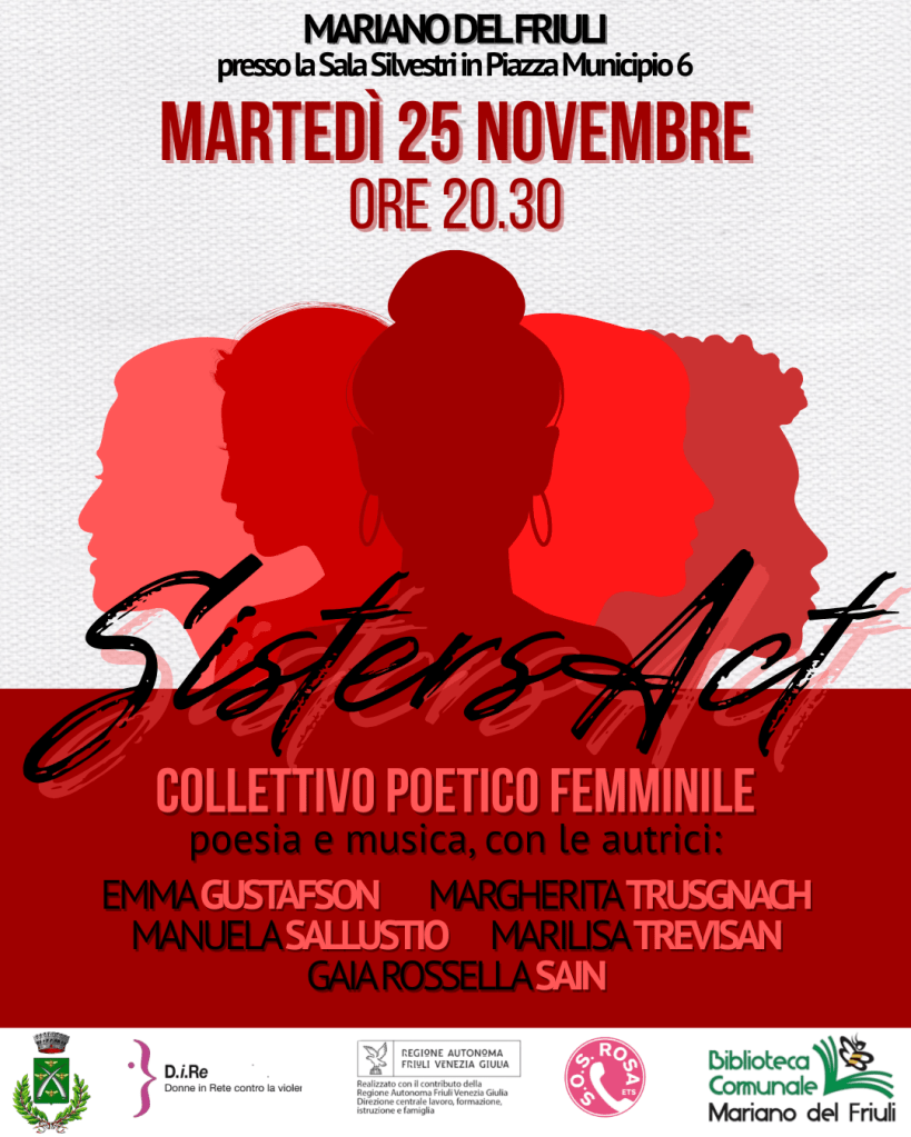 Martedì 25 Novembre ore 20.30, a Mariano del Friuli, torneremo di nuovo in campo come collettivo poetico femminile: in occasione della Giornata internazionale per l’eliminazione della violenza contro le donne, per un reading di musica e poesia voluto e organizzato dalla Biblioteca e dal Comune di Mariano.